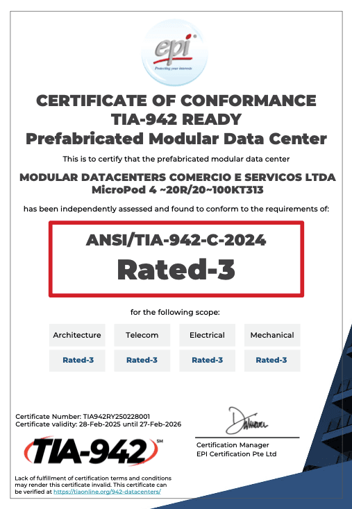 Essa certificação assegura que um data center atende a critérios rigorosos de disponibilidade, desempenho e redundância, garantindo que esteja operacional 99,982% do tempo — o que equivale a um máximo de 1,6 horas de inatividade por ano.